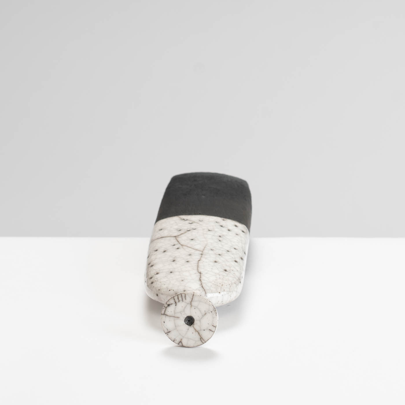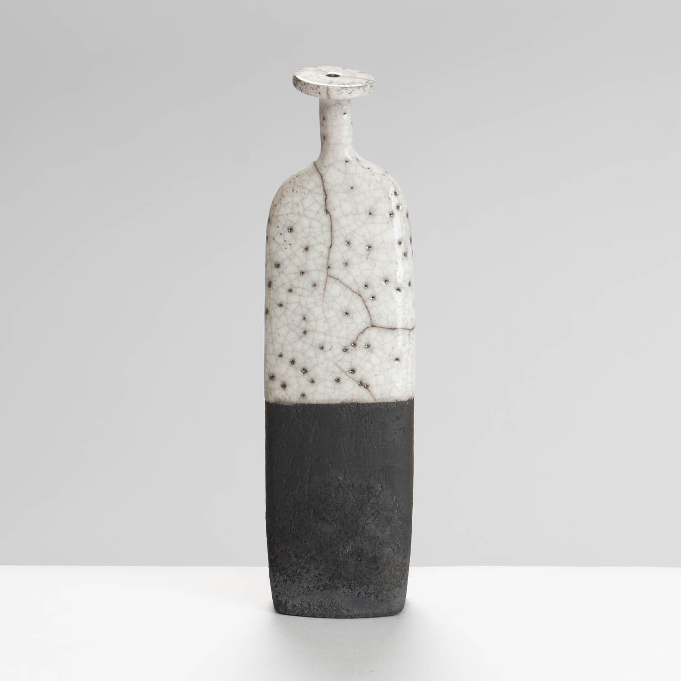 This bottle form is slab-built using Earthstone handbuilding clay and after bisque firing, raku fired which turns all unglazed areas, including the cracks, black.